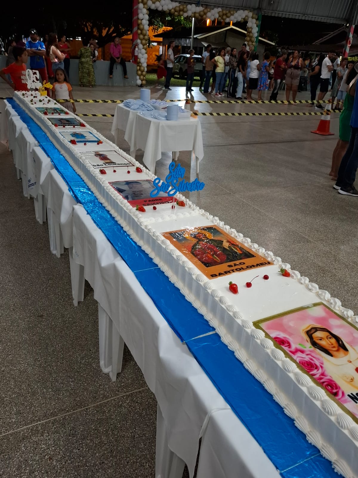 A festa ganhou um toque ainda mais especial quando, para encerrar as festividades, foi partilhado um bolo de 50 metros, uma homenagem aos 50 anos de história da Paróquia. O bolo, que representava os 70 padroeiros das comunidades que formam nossa Paróquia, foi um símbolo de união e gratidão. Durante a partilha, a alegria foi ampliada com uma queima de fogos, que iluminou o céu e marcou a celebração com um toque de festa e emoção. Todos os presentes cantaram parabéns, reforçando a alegria dessa grande conquista.