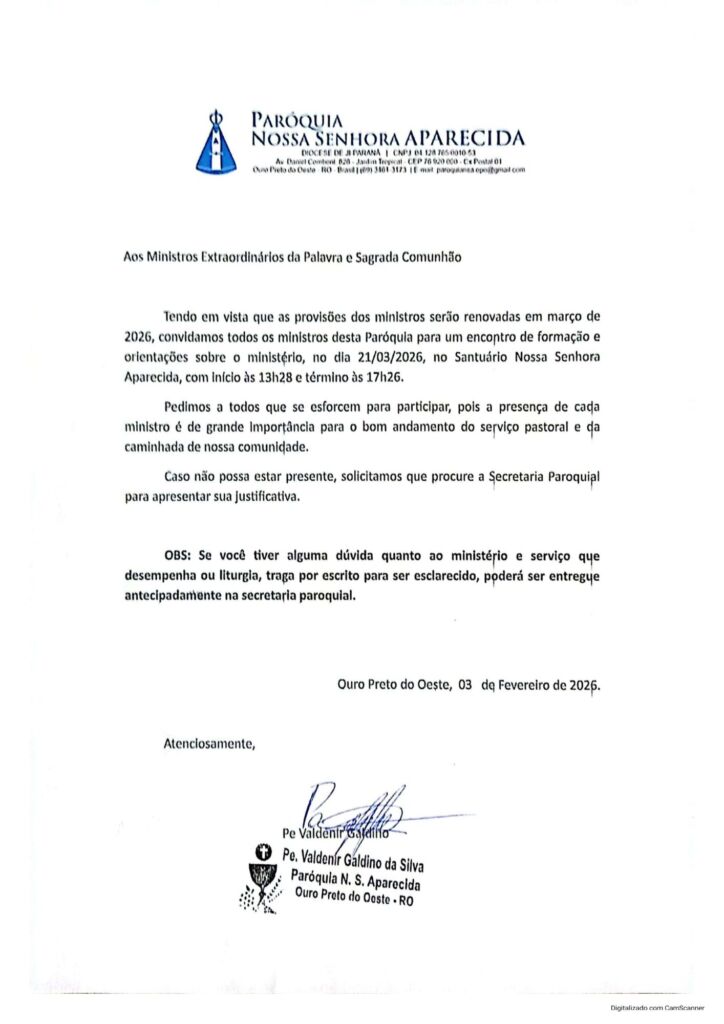 Tendo em vista que as provisões dos ministros serão renovadas em março de 2026, convidamos todos os ministros desta Paróquia para um encontro de formação e orientações sobre o ministério, no dia 21/03/2026, no Santuário Nossa Senhora Aparecida, com início às 13h28 e término às 17h26.